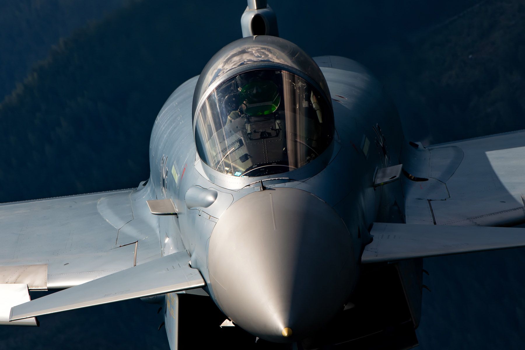 A retractable refuelling probe that is housed under a fairing at the starboard side of the cockpit’s windscreen is available for aerial refuelling via hose-drogue technique. Germany’s IPA3 (98+03) and IPA7 (98+07) conducted trials in October 2008 to clear the aircraft for this operation with the then Luftwaffe’s A310 MRTT fleet, with approval received late that same year. Following retirement of the A310, Eurofighter can currently refuel not only from the A330MRTT and the A400M, but also by the KC-130J. The latter occurred for the first time during Exercise Baltic Hunter at Laage in November 2025.