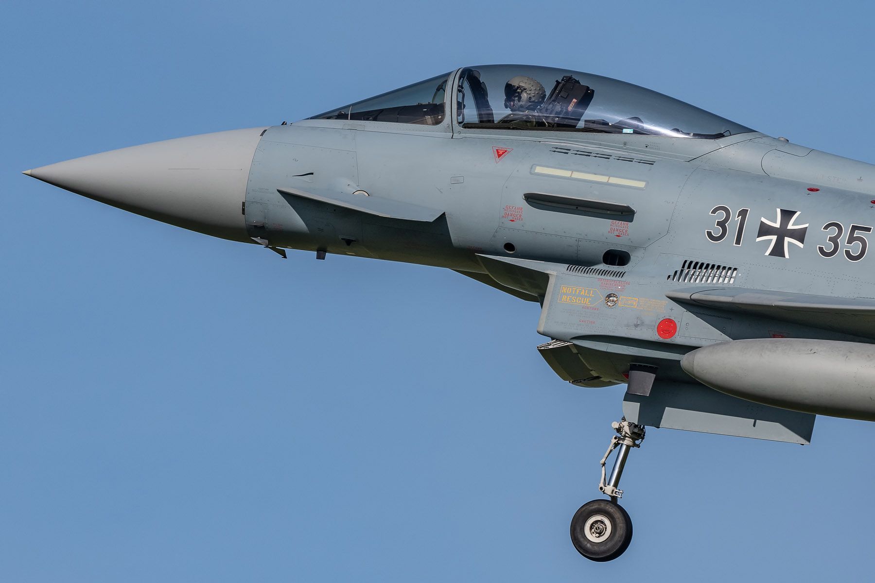 With a basic empty weight of 11t, its maximum take-off weight is 23.5t. It can get airborne in less that 8 seconds from standstill (less than 700m take-off run required), and has a maximum speed of Mach 1.25 at sea level, or Mach 2.35 at altitude according Luftwaffe’s website. The maximum load factors are +9g and -3g.