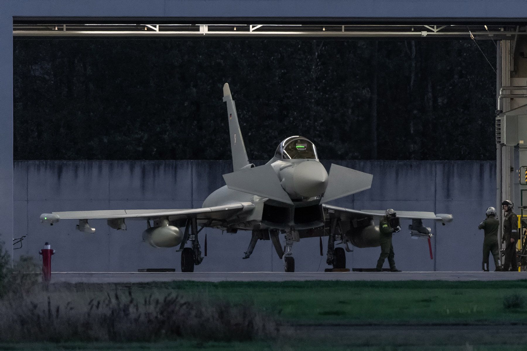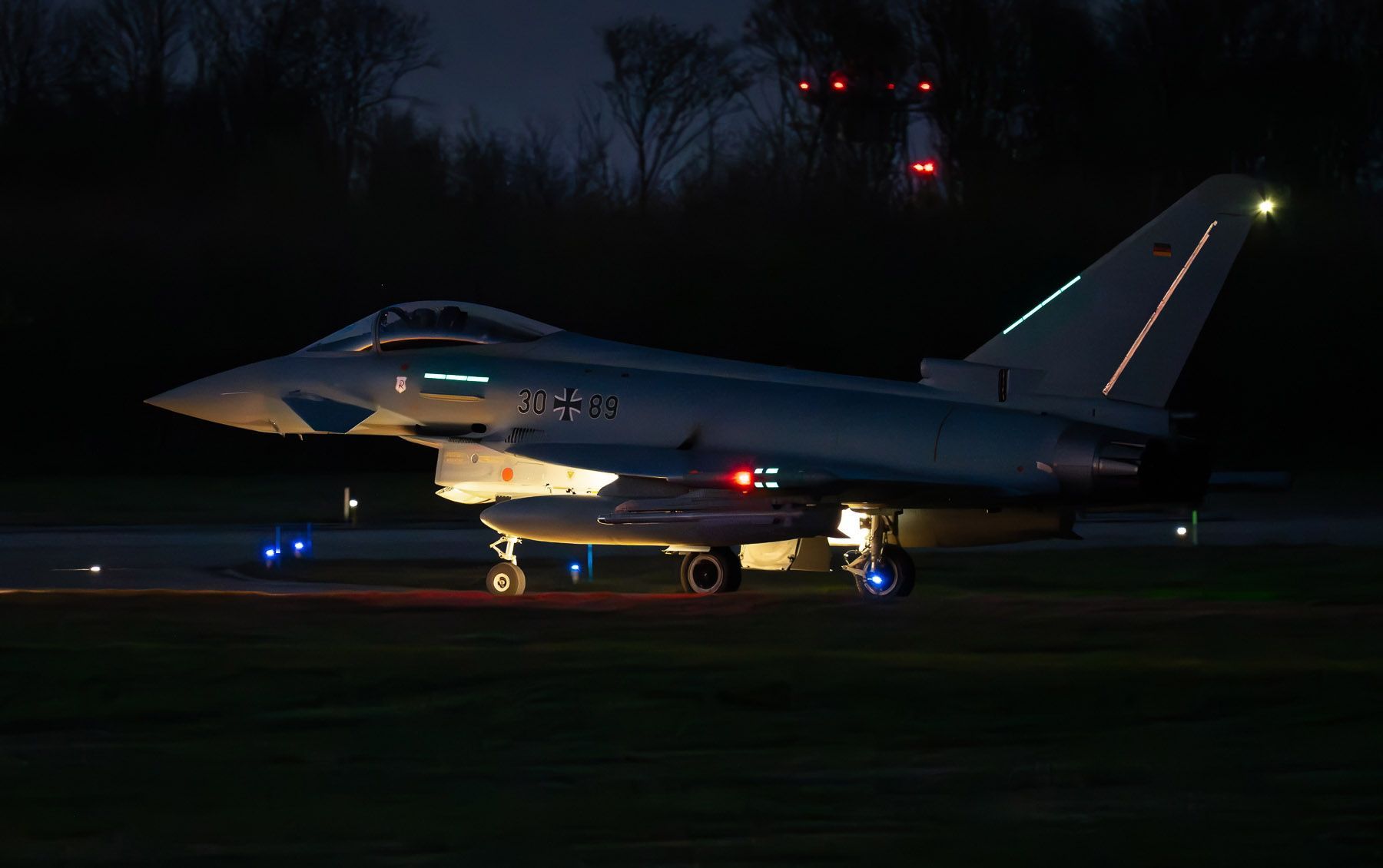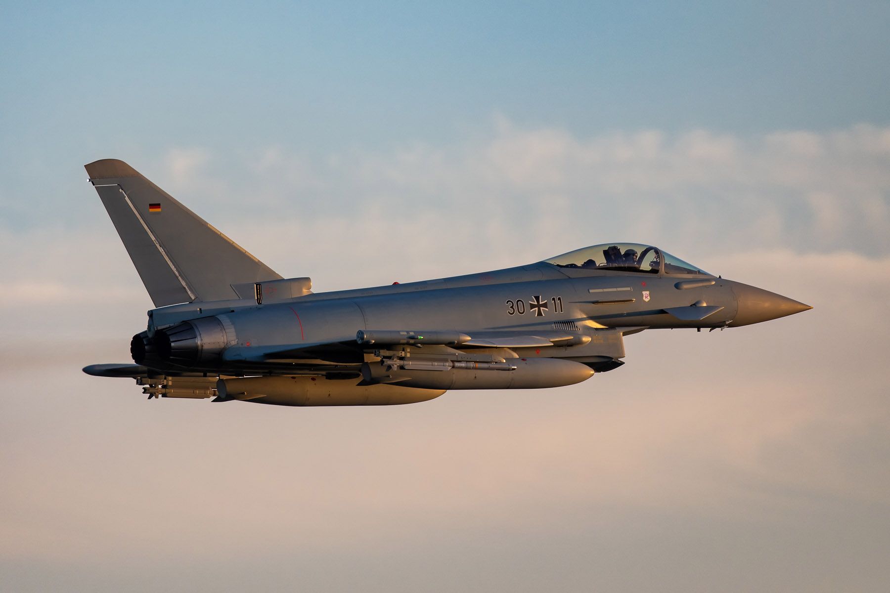 The missile approach warning system uses a pulse-doppler radar to detect both ground- and air-launched missiles, and automatically triggers countermeasures. Chaff dispensers are integrated into the aft of the outer underwing weapon pylons; flares are stowed in the flap track fairings. While the port wingtip pod contains active ECM equipment, the starboard wing pod can hold two towed Sky Buzzer radar decoys that have been cleared for use throughout the whole flight envelope. Generally, these are not installed for day-to-day operations, but can be carried if needed. Only a number of older Block 5 (delivered in Tranche 1) aircraft lack this possibility, identifiable by the red covers on the aft starboard pod. Also, the dual-seat Block 5 aircraft lack the rear missile warning sensor, as do the older single-seaters (up to 30+18) as well as the three oldest Tranche 2 aircraft (31+14/16).